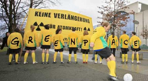 Lassen Sie sich nicht zum Spielball der Konzerne machen, Frau Merkel! Diese Botschaft stand auf dem Fußball, den einer der Greenpeace-Aktivisten zu Beginn der Verhandlungen ins Bundeskanzleramt schoss. Zehn weitere Aktivisten in Fußballtrikots hielten ein Banner mit der Aufschrift: Keine Verlängerung für Atomkraft