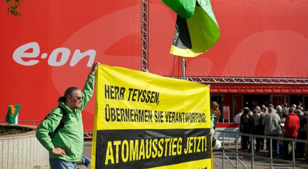 Den unverantwortlichen Unternehmenskurs von E.ON hat Greenpeace heute auf der Jahreshauptversammlung des Energiekonzerns scharf kritisiert. Vor dem Eingang der Grugahalle in Essen standen Greenpeace-Aktivisten mit einem Transparent mit der Aufschrift Herr Teyssen, übernehmen Sie Verantwortung: Atomausstieg jetzt.