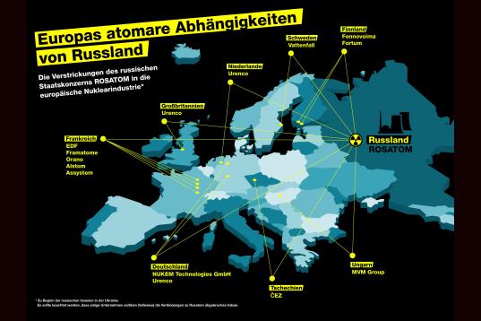 Rosatom ist mit etlichen europäischen Atomkraftdienstleistern verstrickt: Das in Deutschland ansässige Unternehmen NUKEM, das europaweit Atomkraftwerke stilllegt und Atommüll beseitigt, ist ein hundertprozentiges Rosatom-Tochterunternehmen. Die Firma Urenco in Gronau lieferte über 25 Jahre insgesamt 45.000 Tonnen abgereichertes Uran nach Russland – offiziell zur Wiederanreicherung, de facto aber zur Endlagerung. Die französische Atomindustrie, die bei weitem die größte aller EU-Länder ist, arbeitet auf allen Ebenen der Produktionskette eng mit Rosatom zusammen, von der Urangewinnung und der Abfallbehandlung bis hin zum Bau und Betrieb von Kraftwerken.
