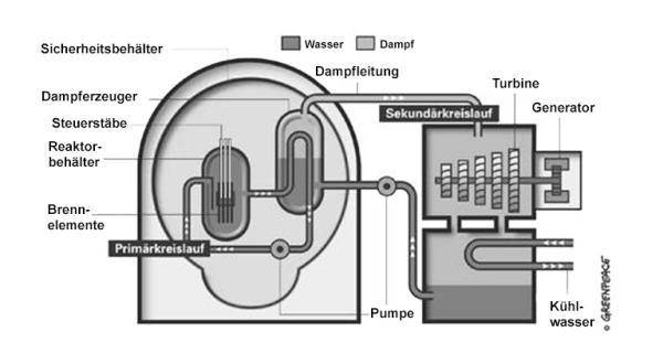 Atomkraftwerke nutzen ähnlich wie Kohlekraftwerke die Energie von Wasserdampf, um an Stromgeneratoren gekoppelte Turbinen anzutreiben. Der Reaktor spielt dabei die Rolle des mit Kohle befeuerten Kessels. Die Wärme entsteht durch die Kernspaltung.