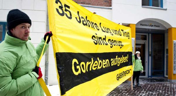 Greenpeace-AktivistInnen haben sich zusammengefunden, um den zukünftigen Regierungsparteien zu zeigen, dass ihre Handlungen aufmerksam beobachtet werden. Edler betont: "Ein rot-grün regiertes Niedersachsen darf einem Endlagerkonsens nur zustimmen, wenn Gorleben aus dem Suchverfahren ausgeschlossen wird. Der Standort ist geologisch mangelhaft, politisch verbrannt und auf Lügen aufgebaut."