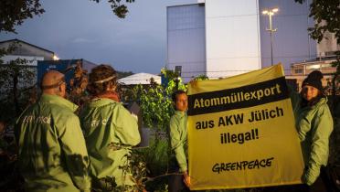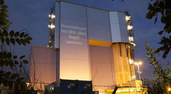 „Atommüllexport aus AKW Jülich – illegal“ projizierten in den frühen Morgenstunden Greenpeace-Aktivisten an das Reaktorgebäude in Jülich. Sie protestierten damit gegen den hochradioaktiven Mülltransport, denn „die Abschiebung wäre illegal und verantwortungslos. Er muss unter allen Umständen verhindert werden“, sagt Heinz Smital, Kernphysiker und Atomexperte von Greenpeace.
