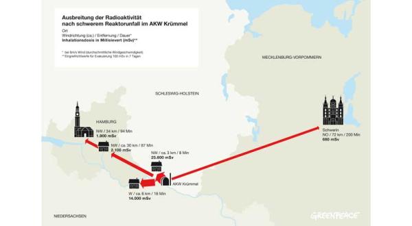 Nach Meinung von Greenpeace handelt Schleswig-Holsteins Atomaufsicht fahrlässig, wenn sie Vattenfall nicht die Betriebsgenehmigung entzieht. Die am Montag veröffentlichten Ausbreitungsrechnungen belegen, dass die 3 bis 30 Kilometer vom Atomreaktor Krümmel entfernt lebenden Kläger einem lebensgefährlichen Risiko ausgesetzt sind. Schon acht Minuten nach Freisetzung würde die radioaktive Wolke den Kläger in Schleswig-Holstein erreichen, der in nur drei Kilometer Entfernung vom AKW lebt. Seine zu erwartende Strahlendosis beträgt 25.000 Millisievert in wenigen Stunden.