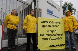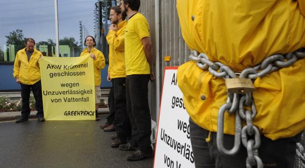 6. Juli 2009 - Greenpeace-Aktivisten verriegeln das Einfahrtstor zum Pannenreaktor Krümmel bei Hamburg. Sie fordern von der Atomaufsicht, dem Betreiber Vattenfall wegen Unzuverlässigkeit die Lizenz zu entziehen. Offenbar ist der Reaktor nur haarscharf an einem Trafobrand vorbeigeschrammt. Ein von Vattenfall vorgelegtes Foto zeigt, wie Öl aus zwei Lecks über eine zu drei Vierteln schwarze, offenbar verschmorte Seitenwand des Maschinentransformators rinnt.