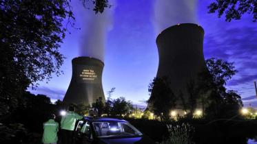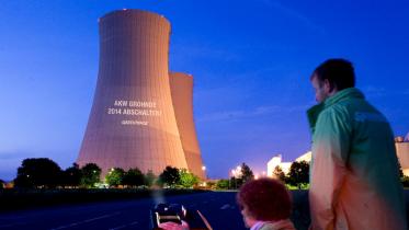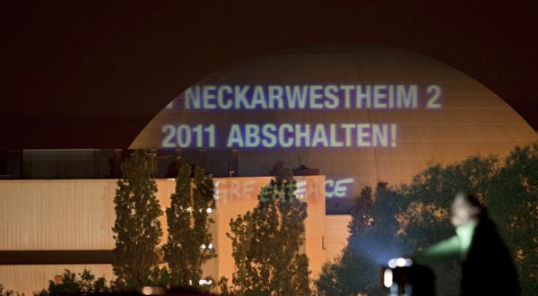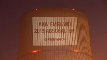 An jedem einzelnen noch laufenden AKW in Deutschland haben die Umweltaktivisten in der Nacht das von Greenpeace jeweils empfohlene Abschalt-Jahr der Reaktoren projiziert.