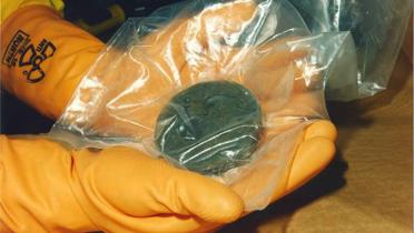 • Ein Mitarbeiter hält reines Plutonium in der Hand, das für die Produktion von Atomwaffen verwendet wird