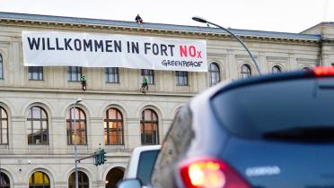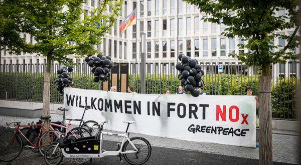 Um den Schaden zu minimieren, treffen sich Industrie und Politik heute zum „Dieselgipfel“ – die Begrüßung der Teilnehmer übernahmen heute Morgen allerdings Greenpeace-Aktivisten. Sie hängten ein 20 Meter breites Banner mit der Aufschrift „Willkommen in Fort NOx“ über den Haupteingang des Bundesverkehrsministeriums in Berlin – eine Anspielung auf den hochgesicherten Armeestützpunkt, in dem die USA Teile ihrer Goldreserven hortet; „NOx“ ist die Abkürzung für gesundheitsgefährdende Stickoxide, von denen gerade Dieselfahrzeuge besonders viele ausstoßen. Was hinter den ministerialen Mauern geschützt werden soll, ist allerdings kein Füllhorn an Reichtümern, sondern eine Industrie, die mit dem Segen der Politik die Gesundheit der Bevölkerung aufs Spiel setzt. Der Tagungsort wurde kurzfristig "aus technischen Gründen", so die offizielle Stellungnahme, ins Innenministerium verlegt.