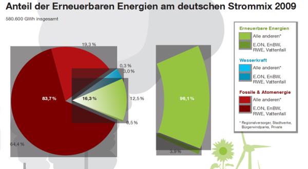 Regionalversorger, Stadtwerke, Bürgerwindparks und Privathaushalte tragen 32 Prozent zur Energieversorgung Deutschlands bei. Gleichzeitig stammen von ihnen 12,5 Prozent des aus Sonne und Wind erzeugten Stroms. Dagegen wirken die 0,5 Prozent - der Anteil, den die vier großen Energieversorger beitragen - beinahe lächerlich.