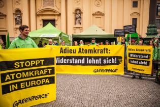 Protest von Greenpeace mit symbolischen Atommüll-Fässern vor der CSU-Parteizentale in München, nachdem Markus Söder und seine Partei kurz vor dem Atomausstieg weiter die Laufzeitverlängerung der AKW gefordert hatten.