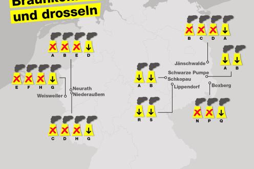 Dabei sind sowohl Kraftwerke im Rheinischen Revier wie Niederaußem, Weisweiler und Neurath zur sofortigen Abschaltung vorgesehen wie auch Braunkohlekraftwerke in der Lausitz, etwa Jänschwalde und Boxberg. Der Vorschlag, bei einem weiteren Drittel der deutschen Braunkohlekraftwerksblöcke (7,4 Gigawatt) die Laufleistung zu drosseln – und zwar moderat von derzeit jährlich im Durchschnitt zirka 7000 Volllaststunden auf 6000 Volllaststunden – soll den Regionen Zeit und Luft für den notwendigen Strukturwandel verschaffen.