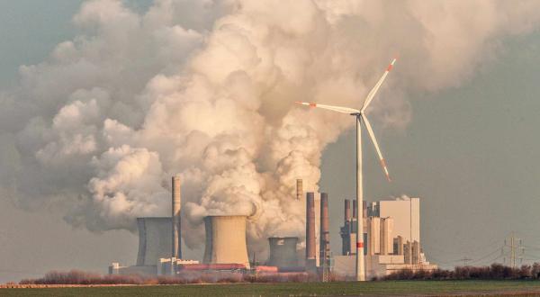 Windrad vor dem qualmenden Kohlekraftwerk Neurath