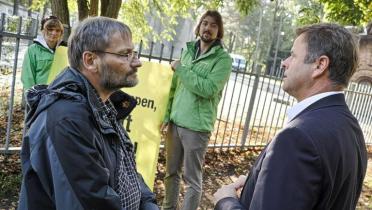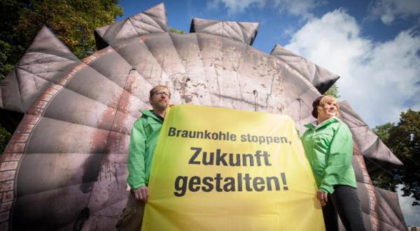 „Braunkohle stoppen, Zukunft gestalten“ fordert das Banner, das die Umweltschützer an diesem Samstag zusammen mit einem fünf Meter hohen, aufblasbaren Braunkohle-Baggerrad vor dem Kongresshotel in Potsdam positionierten. Hinter den Türen des Hotels unterhalten sich SPD und Die Linke, welche Politik eine gemeinsame Regierung verfolgen soll. Ein Streitpunkt dabei: die Energiepolitik.