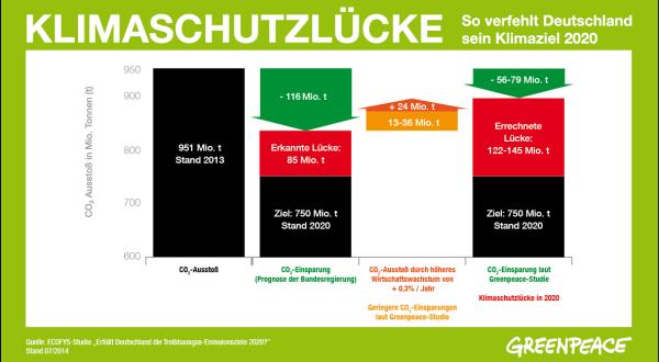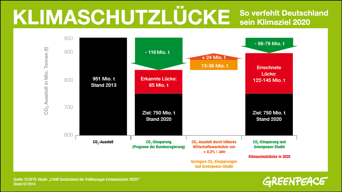 Nach dem neusten Stand müssen in Deutschland bis zu 121 Millionen Tonnen CO2 eingespart werden, statt der bisher kalkulierten 85 Millionen Tonnen. Dies belegt eine Studie des energiepolitischen Beratungsunternehmens Ecofys im Auftrag von Greenpeace. Nur so kann das Ziel einer CO2-Reduktion von 40 Prozent bis 2020 noch eingehalten werden.