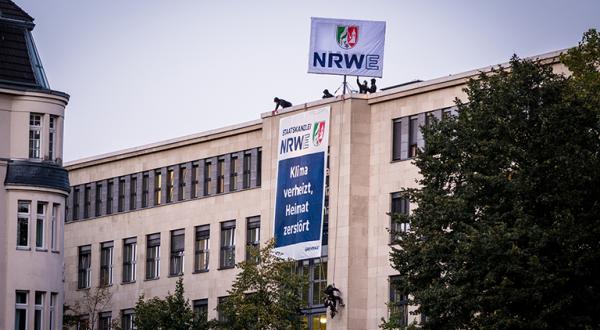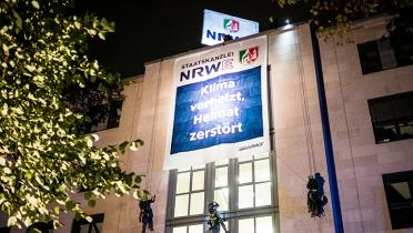 Ein riesiges Logo mit dem Schriftzug “NRWE” dreht sich seit heute Früh auf dem Dach der nordrhein-westfälischen Staatskanzlei in Düsseldorf. Greenpeace-Aktivistinnen und -Aktivisten haben darunter ein großes Banner befestigt mit der Aufschrift: „Staatskanzlei NRWE: Klima verheizt, Heimat zerstört“. Das entsprechend angepasste Landeswappen darauf zieren nun typische Symbole aus dem Braunkohle-Business: Abrissbirne und Schaufelrad. Mit der Aktion protestieren die Aktivist*innen gegen die Klientelpolitik des nordrhein-westfälischen Ministerpräsidenten: Wenn Armin Laschet (CDU) schon dafür sorgt, dass sich RWE bei ihm ganz wie zu Hause fühlen kann, dann soll das auch sichtbar werden. Denn der Landesvater pampert eher den umstrittenen Energiekonzern RWE statt sich vor Hunderte seiner Bürgerinnen und Bürger zu stellen, die für den Ausbau des Tagebaus Garzweiler II ihre Heimat verlassen müssen.