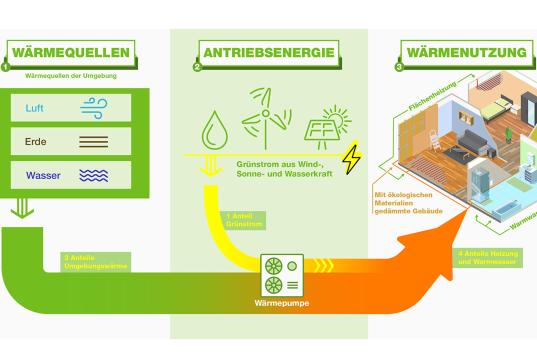 Wärmepumpen nehmen die Energie aus Umgebungsluft, dem Grundwasser oder dem umgebenden Erdreich und wandeln sie durch Wärmetauscher in höhere Temperaturen um. Dazu benötigen sie Strom. Damit Wärmepumpen also wirklich klimaneutrale Wärme liefern, müssen sie mit Strom betrieben werden, der aus erneuerbaren Energien stammt. Mit einem Anteil Grünstrom und zwei bis drei Anteilen Umgebungswärme machen Wärmepumpen drei bis vier Anteile grüne Wärme.