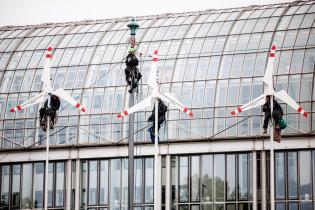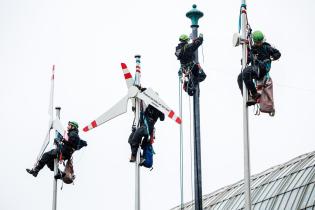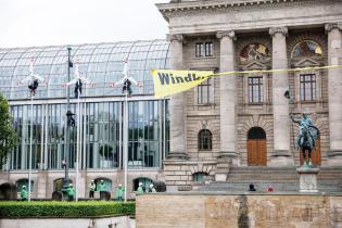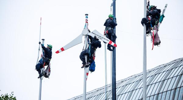 Denn an diesem Mittwoch, kurz vor Sonnenaufgang, pirschen sich 26 Greenpeace-Aktive an die Staatskanzlei heran. Unentdeckt von den regelmäßig vorbeifahrenden Streifenwagen, gelangen sie an ihr Ziel. An die rund acht Meter hohen Fahnenmasten stellen sie in Windeseile mitgebrachte Leitern und beginnen mit dem Aufstieg. Die ersten Meter sind dank der Leitern schnell überwunden, dann beginnt die harte Arbeit. Mit Seilen und Karabinern ausgestattet, ziehen sie sich Zentimeter für Zentimeter an den glatten Metallstangen empor. Oben angekommen, befestigen sie sechs Rotoren und ein Banner. Geschafft. Die Sonne geht auf und strahlt über etwas, was man in Bayern sonst nicht so oft zu Gesicht bekommt: Sechs Windräder. Zwischen ihnen erstreckt sich ein 25 Meter langes Banner mit der Botschaft: “Windkraft statt heißer Luft, Herr Söder”.