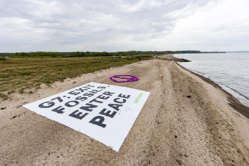 Im Mai begleiteten Greenpeace-Aktive die Zusammenkunft der Außenminister:innen von Deutschland, Frankreich, Italien, Japan, Kanada, der USA und dem Vereinigten Königreich in Weissenhaus in Schleswig-Holstein, eines der vorbereitenden Treffen des G7-Gipfels in Elmau. Dort protestierten sie für einen raschen Ausstieg der G7-Staaten aus Kohle, Öl und Gas. Die Aktiven breiteten ein 12 mal 12 Meter großes Banner mit der Aufschrift „G7: Exit Fossils, Enter Peace” (G7: Raus aus den Fossilen, hin zum Frieden) auf dem Sand aus. Daneben formierten sie ein acht Meter großes Peace-Symbol.
