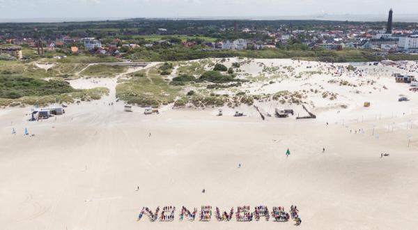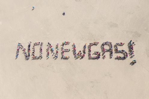Gasbohrungen im Wattenmeer gefährden Wale! Gemeinsam mit Bewohner:innen Borkums demonstrierten Greenpeace-Aktivist:innen heute am Strand der Nordseeinsel. Mit der aus rund 250 Menschen geformten, 50 Meter langen Forderung “No New Gas” protestierten sie gegen das geplante Erdgasprojekt vor der Küste und forderten, auch andere zerstörerische Gasbohrungen einzustellen.