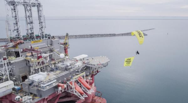 Noch liegen den Betreiberfirmen nicht alle Genehmigungen für das Projekt vor. Und gegen eine zugunsten des dreckigen Vorhabens ausgefallene Umweltschutzprüfung hat Greenpeace Rumänien beim Verwaltungsgericht in Bukarest Klage eingereicht. Dennoch steht im Hafen der rumänischen Küstenmetropole Konstanza bereits die Bohrplattform “Transocean Barents” in den Startlöchern, um schon bald hinaus aufs Schwarze Meer geschleppt und dort installiert zu werden. Greenpeace-Aktivist:innen haben dagegen am 15. Januar ein deutliches Zeichen gesetzt. Einer der Klimaschützer:innen ist mit einem Gleitschirm und einem Banner mit der Aufschrift “Stop Fossil Gas” über die Bohrplattform “Transocean Barents” geflogen.