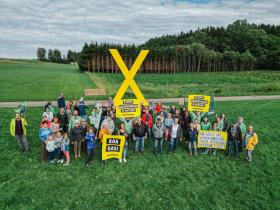 4.7.2024: 150 Menschen bei einer Kundgebung am Bohrplatz, das gelbe "Koa Gas"-X wird an der Kreisstraße aufgestellt.