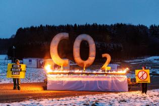 Greenpeace-Aktivist:innen protestieren mit einem brennenden CO2-Zeichen vor der Bohrstelle. 120 Demonstrant:innen ziehen zwei Tage später in einem Lichterspaziergang vom Reichlinger Rathaus zum Bohrplatz.