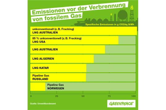 Fakt: Falsch! Klimafreundlich ist nur die Energieerzeugung aus Sonne, Wind und anderen Erneuerbaren. Bei Liquefied Natural Gas (LNG) aus den USA und Australien handelt es sich oft um Fracking-Gas, das noch klimaschädlicher ist als konventionelles Gas. LNG aus den USA ist über sechsmal und aus Australien rund 7,5-mal klimaschädlicher als fossiles Pipelinegas aus Norwegen.
