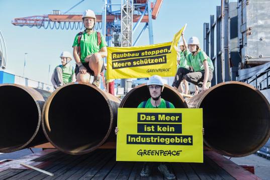 Es ist ein sonniger Donnerstagmorgen, an dem die vier kleinen Schlauchboote vorsichtig ins Wasser gelassen werden und mit Bannern und Farbe bewaffnet auf den ca. 200 Meter langen Frachter zusteuern. Auf der Weser am Brakener Hafen unweit von Bremerhaven ist an diesem Tag wenig los, und so gelangen die Boote unbemerkt an ihr Ziel. Jetzt muss alles ganz schnell gehen: Während die Greenpeace-Aktivist:innen von zwei Booten aus eine Botschaft an die Seite des Frachters malen, klettern die anderen geschwind auf die Pier und setzen sich auf die dort gelagerten Pipelinerohre. Vier winzige Boote mit einer riesigen Botschaft: Das Meer ist kein Industriegebiet.