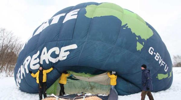 Unter dem Heißluftballon, auf dem die Erde abgebildet ist, hängt ein sechs mal acht Meter großes Banner mit der Aufschrift: „Mach mit beim Volksbegehren“. Am Boden verteilen Greenpeace-Mitglieder Informationsmaterial an die ansässige Bevölkerung.