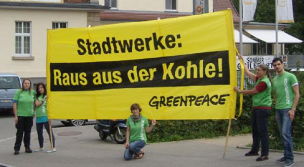 Gesterm Morgen protestierte eine Gruppe von Greenpeace-Aktivisten in Tübingen gegen die Weiterführung des Projekts KKW Brunsbüttel. Mit dem Slogan Stadtwerke: Raus aus der Kohle! zeigten sie den Beteiligten des KKWs, die sich auf der Gesellschaftsversammlung im Wirtshaus Casino am Neckar einfanden, klipp und klar ihre Meinung. Die Aktivisten kämpfen seit längerem für das Ende des verfehlten Projekts und schlagen vor, das frei gewordene Geld stattdessen in erneuerbare Energieprojekte, wie Wind, Sonne oder Wasser zu investieren.