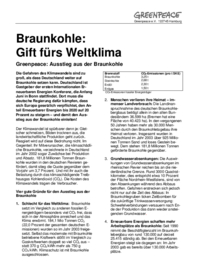 Die Verbrennung von Braunkohle ist nach Ansicht von Greenpeace eine der schlimmsten Gefahren für das Weltklima. 22 Prozent der gesamten deutschen Kohlendioxidemissionen im Jahr 2003 gingen auf das Konto der Braunkohleverbrennung: 184,1 Millionen Tonnen. Greenpeace fordert den Energiekonzern RWE deshalb auf, die Planungen für Neurath zu überdenken.
