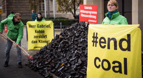 Dass der Wirtschaftsminister dringend handeln muss, daran haben ihn Greenpeace-Aktivisten heute erinnert. Die Umweltschützer kippten dem Vizekanzler acht Tonnen Kohle vor den Eingang seines Ministeriums in Berlin. „Gabriels Aktionsprogramm Klimazerstörung“ prangt auf einem Schild im Braunkohlehaufen. Gleichzeitig fordert Greenpeace den Vizekanzler per Petition zum Kohleausstieg auf.