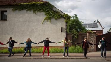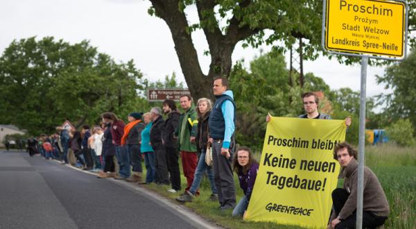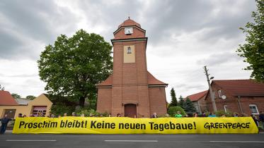 Die Aktivisten aus ganz Deutschland, Polen und Tschechien sind angereist, um einen schützenden Halbkreis um den Ortskern und die Dorfkirche zu bilden. „Proschim bleibt! Keine neuen Tagebaue“, fordern die Demonstranten auf einem Banner. Hintergrund des Ganzen: Brandenburgs rot-rote Landesregierung will in wenigen Wochen über den geplanten neuen Tagebau Welzow-Süd II entscheiden. Die Linke fordert in ihrem bundesweiten Wahlprogramm den Kohleausstieg. In Brandenburg aber, dem einzigen Bundesland mit Linker Regierungsbeteiligung, werden trotzdem weitere Tagebaue unterstützt. „Die Linke ist wie ein Vegetarier, der ein Schnitzel bestellt. Wenn Katja Kipping und Bernd Riexinger die Glaubwürdigkeit ihrer Partei etwas bedeutet, dann müssen sie dafür sorgen, dass die Brandenburger Minister gegen Welzow-Süd II stimmen“, fordert Anike Peters, Energieexpertin von Greenpeace.