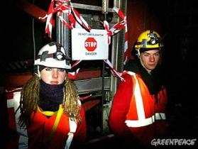 Greenpeace-Kletterer protestieren auf der Baustelle in Eemshaven gegen das größte und dreckigste Kohlekraftwerk der Niederlande. Betreiber ist der führende niederländische Energieversorger Essent, der zu dem deutschen Energiekonzern RWE gehört.