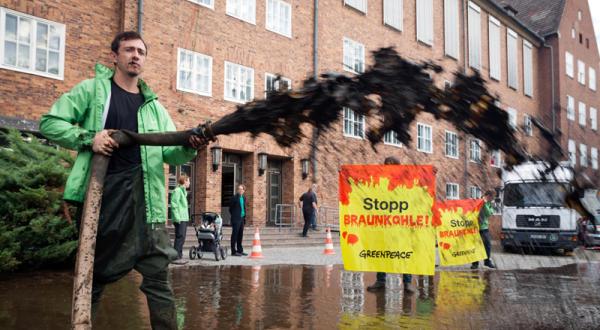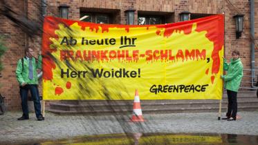 Die Dringlichkeit des Problems unterstrichen die Aktivisten durch Wasser und Schlamm, die sie am Vortag aus dem stark verockerten Spree-Zufluss Wudritz entnommen hatten. Sie präsentierten einen Banner mit der Aufschrift: „Ab heute Ihr Braunkohle-Schlamm, Herr Woidke". "Jeder neue Tagebau zerstört Brandenburgs Umwelt. Wenn Woidke verhindern wolle, dass dies in den kommenden Jahrzehnten so weitergeht, müsse er die geplanten weiteren Tagebaue jetzt stoppen, so Greenpeace Energie-Experte Niklas Schinerl.