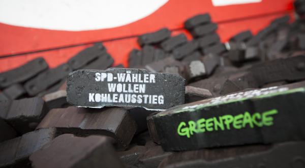 Vor dem roten Logo mit weißen Buchstaben haben sie eine rund zweieinhalb Meter hohe Mauer aus Kohlebriketts zum Einsturz gebracht. "Die SPD muss heute in ihrem Regierungsprogramm die Weichen stellen für einen Kohleausstieg bis 2040", sagt Greenpeace-Energieexperte Gerald Neubauer.