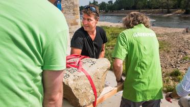 Greenpeace-Aktivisten platzierten heute bei historischem Niedrigwasser einen sogenannten Hungerstein in der Elbe bei Magdeburg: eine bleibende Mahnung zum Klimaschutz.