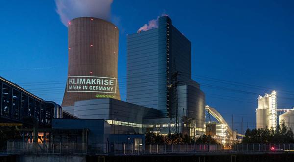 Greenpeace-Aktivistinnen und -Aktivisten projizieren auf den 180 Meter hohen Kühlturm des Kraftwerks Datteln 4 „Klimakrise – Made in Germany“.