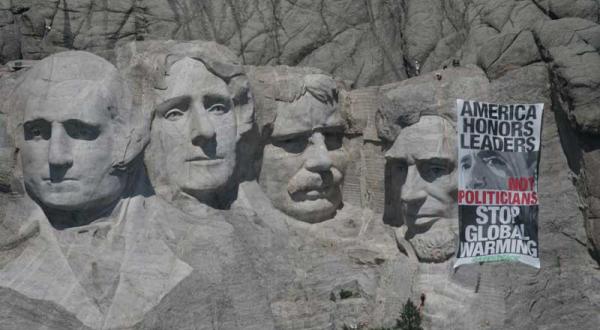 Kletterer am Mount Rushmore für den Klimaschutz, Juli 2009