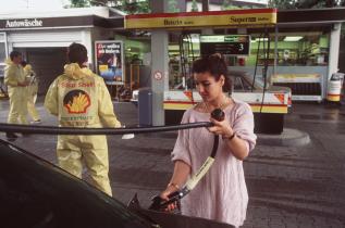 An deutschen Shell-Tankstellen verteilen Greenpeacer Flugblätter an Autofahrer: innen, um sie auf den Umweltskandal aufmerksam zu machen.