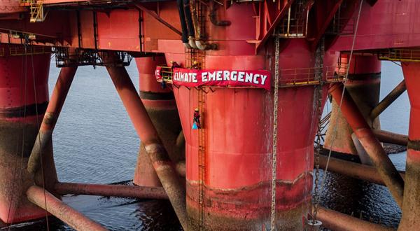 Seit neun Tagen halten Greenpeace-Aktivisten und Aktivistinnen den Öl-Konzern BP in Atem; „Klimanotstand“ steht auf dem Banner, mit dem sie auf eine Ölplattform kletterten.
