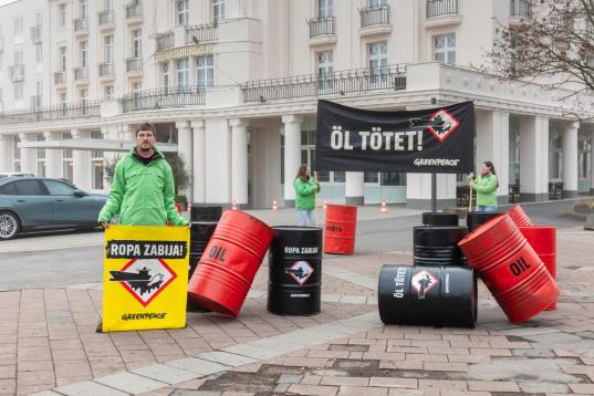 Die Schattenflotte beschäftigte auch die Umweltminister:innen der Bundesländer Ende November 2024. Käme es auf der Ostsee zu einer Ölkatastrophe, müssten Schleswig-Holstein und Mecklenburg-Vorpommern die Aufräum- und Reinigungsarbeiten organisieren. Auch mit den negativen Folgen für den Tourismus wären die Länder direkt konfrontiert. Deshalb war der künftige Umgang mit der Schattenflotte auch Thema auf der Umweltministerkonferenz (UMK) im rheinland-pfälzischen Bad Neuenahr-Ahrweiler. Greenpeace- Aktive forderten dort ein starkes Signal von der UMK an die Bundestregierung. Vor dem Konferenzgebäude schichteten die Protestierenden 14 Ölfässer auf und wiesen mit einem Banner “Öl tötet!” auf die Gefahren der Schattenflotte hin.