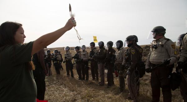 Am 20. November 2016 setzt die Polizei in der Nähe vom Sacred Stone Camp Wasserwerfer, Tränengas und Gummigeschosse ein, um gegen die Water Protectors vorzugehen. 167 Menschen werden verletzt.