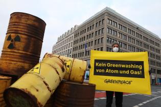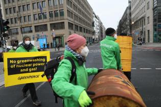 • Am 6. Dezember 2021 protestieren Greenpeace-Aktivist:innen vor der Ständigen Vertretung der EU-Kommission in Berlin. Mit sieben gelben Atomfässern erinnerten sie EU-Komissionspräsidentin Ursula von der Leyen an die Gefahren der Atomkraft. Am nächsten Tag stellen Aktivist:innen einen riesigen Dinosaurier vor dem Sitz der Europäischen Kommission und des Europäischen Rates in Brüssel auf, um gegen die mögliche Aufnahme von fossilem Gas und Atomenergie in die EU-Taxonomie zu protestieren.
