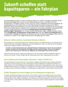 - Klimaschutzanliegen wie das Aktionsprogramm Natürlicher Klimaschutz zu Waldschutz und zur Wiedervernässung von Mooren, der Nationalen Klimaschutzinitiative zur Förderung von z.B. Lastenradinitiativen, oder die überfällige Sanierung der Bahn sind gefährdet. In den Jahren 2024 bis 2027 waren bislang insgesamt 12,5 Mrd. Euro an KTF-Geldern für die Bahn eingeplant, davon alleine im kommenden Jahr 4 Mrd. Euro.