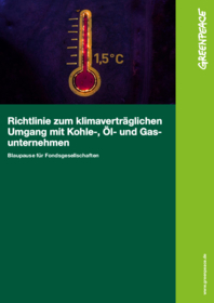 Fondsgesellschaften kommt eine besondere Verantwortung zu, nicht nur wirtschaftlich und gesellschaftlich, sondern gerade auch treuhänderisch: Ihr Pflicht ist es, das anvertraute Vermögen im Einklang mit der geltenden Gesetzeslage zu verwalten und Risiken zu reduzieren. Was sind die wichtigsten ersten Schritte hin zu einer klimaverträglichen Fondspalette? Greenpeace hat dazu einen sofort anwendbaren Ausstiegsplan speziell für Asset manager entwickelt, basierend auf den aktuellen Erkenntnissen der Klimawissenschaft. Eine Blaupause, um den Ausstieg aus Kohle, Öl und Gas in die Wege zu leiten.
