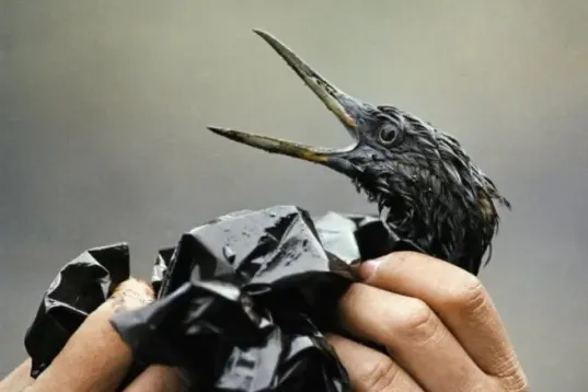 Verölter Vogel im Prince William-Sund in Alaska 1989 kurz nach der Exxon-Valdez-Ölkatastrophe.