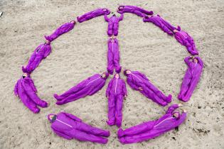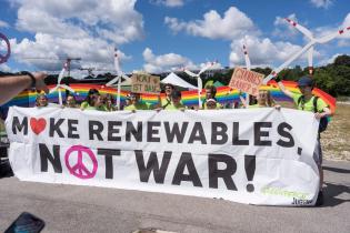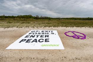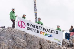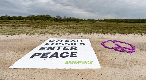 Im Mai begleiteten Greenpeace-Aktive die Zusammenkunft der Außenminister:innen von Deutschland, Frankreich, Italien, Japan, Kanada, der USA und dem Vereinigten Königreich in Weissenhaus in Schleswig-Holstein, eines der vorbereitenden Treffen des G7-Gipfels in Elmau. Dort protestierten sie für einen raschen Ausstieg der G7-Staaten aus Kohle, Öl und Gas. Die Aktiven breiteten ein 12 mal 12 Meter großes Banner mit der Aufschrift „G7: Exit Fossils, Enter Peace” (G7: Raus aus den Fossilen, hin zum Frieden) auf dem Sand aus. Daneben formierten sie ein acht Meter großes Peace-Symbol.