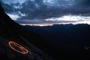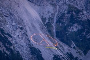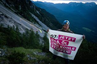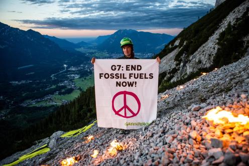 In der Nacht auf Sonntag, den 26. Juni, installierten Greenpeace-Aktive an einem Hang nahe des G7- Tagungsorts Schloss Elmau ein Bergfeuer in Form eines Peace-Zeichens mit einem Durchmesser von 60 Metern. Auf Transparenten forderten sie: “G7: Exit Fossils, Enter Peace” und “G7: Jetzt Gas, Öl und Kohle stoppen”. Aus Feuer geformte Bilder in den Berggipfeln sind im Alpenraum eine Tradition zur Sommersonnenwende, die bis ins Mittelalter zurückgeht.