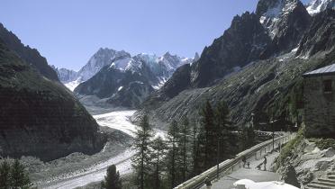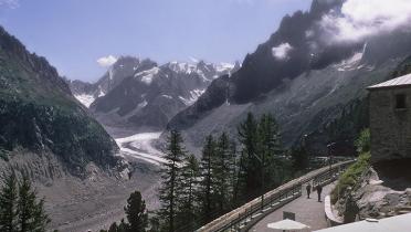Mer de Glace (Frankreich): Das Eismeer (Mer de Glace) ist der größte Gletscher Frankreichs und der viertgrößte Gletscher der Alpen. Das Mer de Glace besteht aus mehreren Einzelgletschern, die zusammen ca. 12 Kilometer lang sind und in der Breite zwischen 700 und 1950 m variieren. Die Fließgeschwindigkeit dieses Gletschers beträgt durchschnittlich 90 m pro Jahr. Charakteristisch für das Mer de Glace sind die abwechselnd hellen und dunklen Bänder, die wie »Jahresringe« quer zur Fließrichtung über den Gletscher ziehen. Das Mer de Glace zieht sich immer weiter zurück und ist mittlerweile über zwei Kilometer kürzer und bei Montenvers um 130 m dünner.