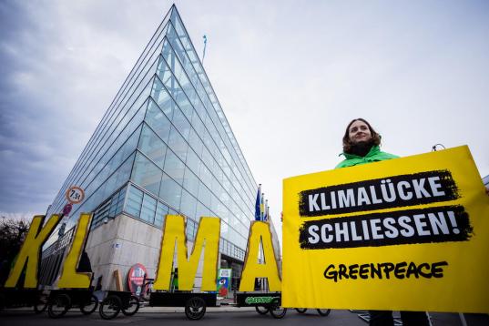 Aktive von Greenpeace illustrieren die Klimalücke während der Koalitionsverhandlungen von CDU und SPD